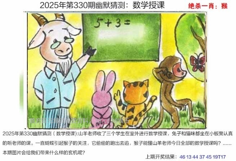 山羊老师收了三个学生在室外进行数学授课,兔子和猫咪都坐在小板凳认真的听老师的课。一直蝴蝶引起猴子的关注,它偷偷的跑出去追,猴子能懂山羊老师今日全部的数学授课吗?..本期图片会给我们带来什么样的玄机呢?